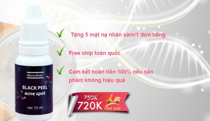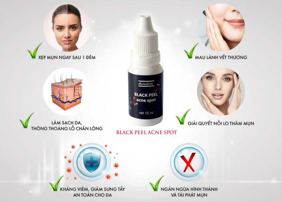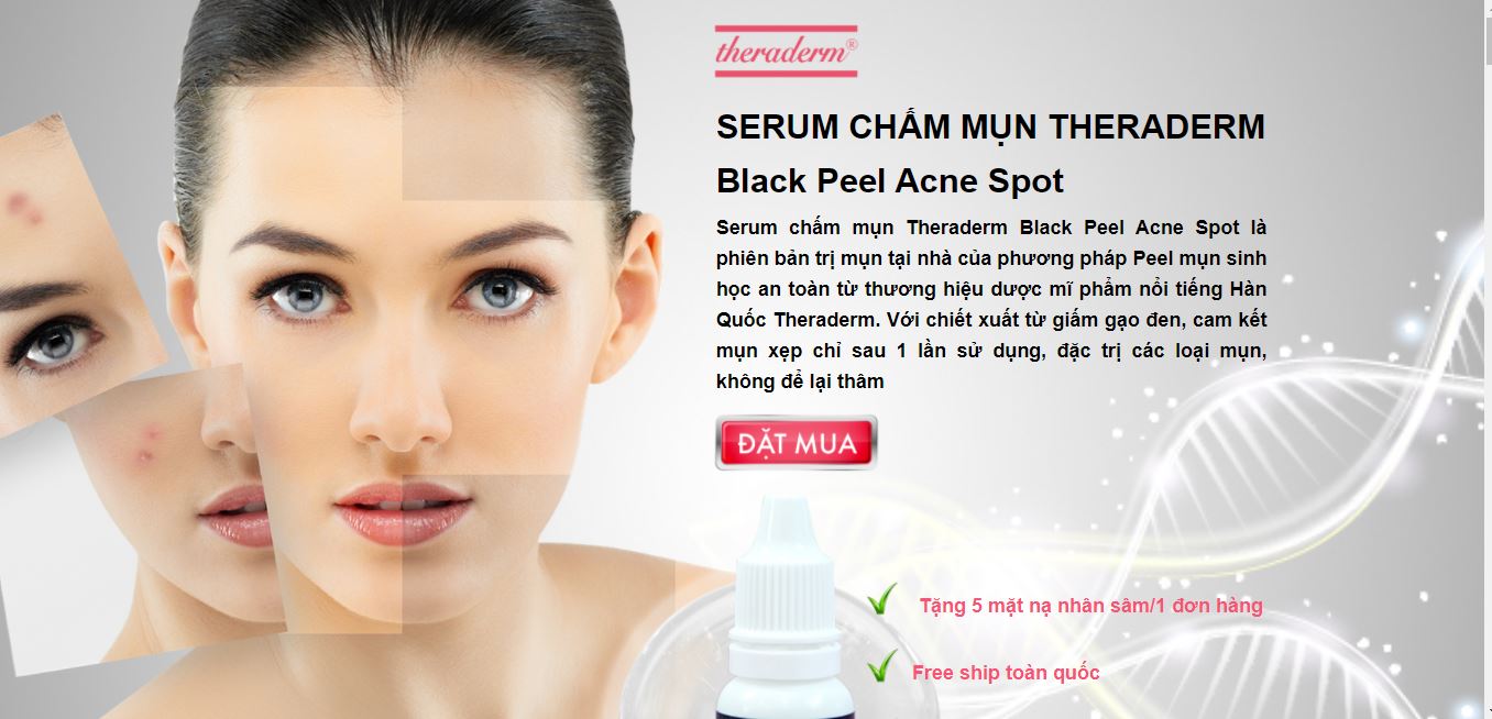SERUM CHẤM MỤN THERADERM – Black Peel Acne SpotSerum chấm mụn Theraderm Black Peel Acne Spot là phiên bản trị mụn tại nhà của phương pháp Peel mụn sinh học an toàn từ thương hiệu dược mĩ phẩm nổi tiếng Hàn Quốc Theraderm. Với chiết xuất từ giấm gạo đen, cam kết mụn xẹp chỉ sau 1 lần sử dụng, đặc trị các loại mụn, không để lại thâm